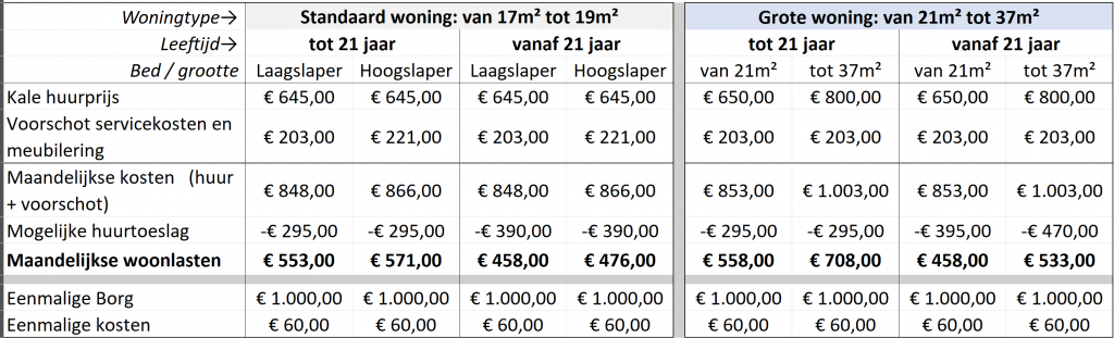 Bij het voorschot voor de servicekosten zit het volgende allemaal inbegrepen; supersnel internet, stoffering en meubilering, nutskosten en verwarming van je eigen woning en de gemeenschappelijke ruimtes, beveiliging en schoonmaak van de gemeenschappelijke ruimtes.